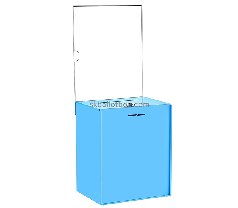 The custom blue plexiglass suggestion box is a vibrant and engaging platform for feedback. Its striking blue hue infuses energy while maintaining professionalism. Crafted from durable plexiglass, it ensures longevity and a sleek appearance. The clear sign plate adds clarity, guiding users to share their thoughts effortlessly.