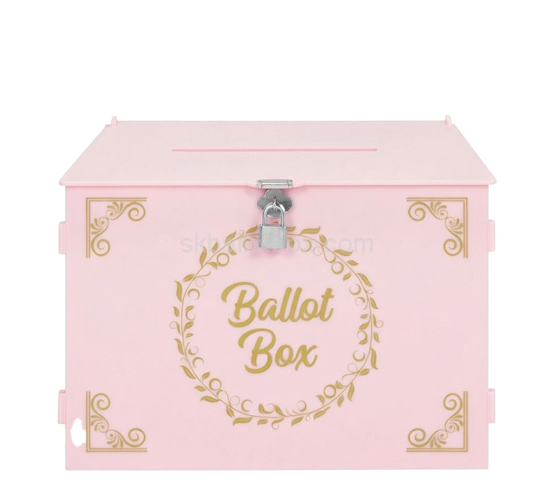 Custom translucent pink acrylic ballot voting collection box with printing, crafted from durable high-quality acrylic for clarity and strength. Custom logos, text, or graphics can be printed for branding or events. Ideal for voting, raffles, suggestions, or donations, keeping ballots secure, organized, and clearly visible.