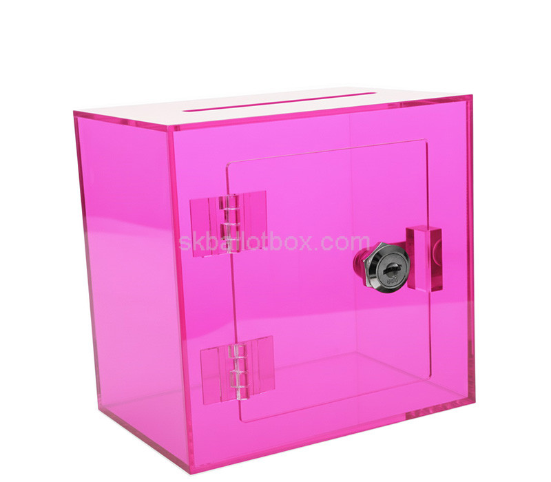 Custom translucent pink acrylic feedback collection box designed for public spaces, offering a secure, modern way to gather comments and suggestions. Its vibrant color and durable build enhance visibility and usability. Your goods are delivered with no hidden charges—door-to-door service to the US, Europe, and select Asian countries.