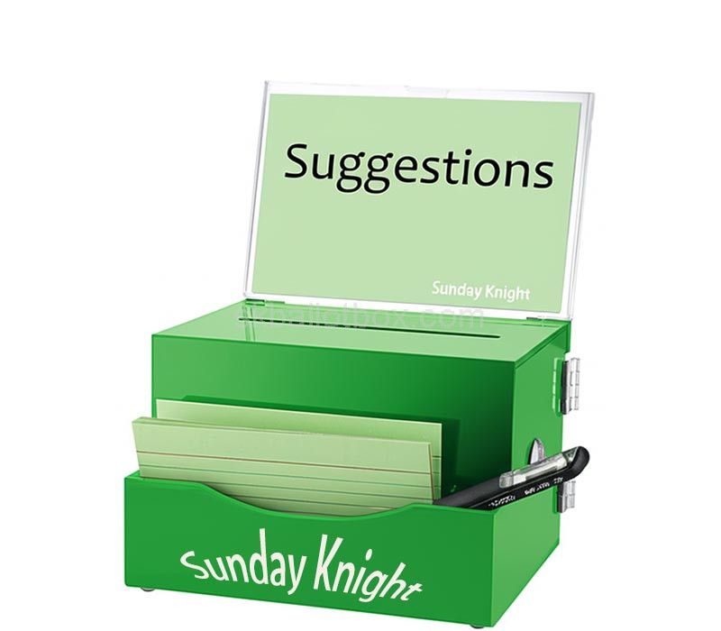 Custom green acrylic retail suggestion box with notepad sign holder — vibrant and functional for collecting customer feedback and ideas, featuring a convenient notepad holder. Ideal for retail spaces seeking to engage shoppers. Delivered door-to-door with all taxes paid, ensuring a hassle-free, all-inclusive purchase and delivery experience.