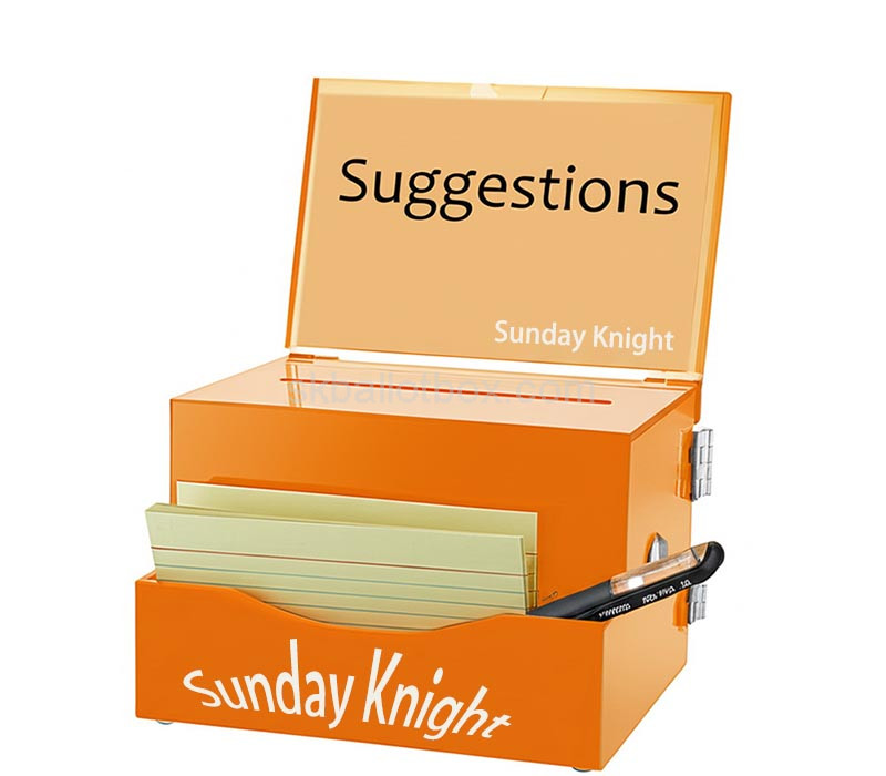 Custom orange acrylic stores suggestion box with notepad sign holder — eye-catching and practical for gathering customer feedback while keeping a notepad handy for quick notes. Perfect for retail environments. Delivered all-in to your door with no extra fees, ensuring a smooth and worry-free shopping experience from start to finish.