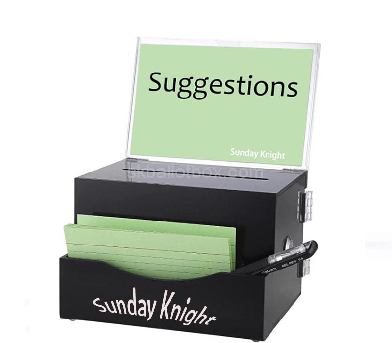 Custom black acrylic suggestion box with brochure sign holder — ideal for collecting feedback, votes, or ideas while displaying promotional materials. Sleek, durable, and versatile for offices, events, or retail spaces. Delivered right to your doorstep with all fees included, ensuring a smooth, worry-free purchasing experience from start to finish.
