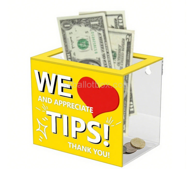 Custom acrylic tip box for restaurants, designed to blend seamlessly with your countertop while encouraging generous tipping. Made from premium clear acrylic for a clean, professional look. Durable, secure, and easy to clean. Shipping includes everything—taxes, duties, and even a smile—delivered hassle-free to the US, UK, EU, and Asia.