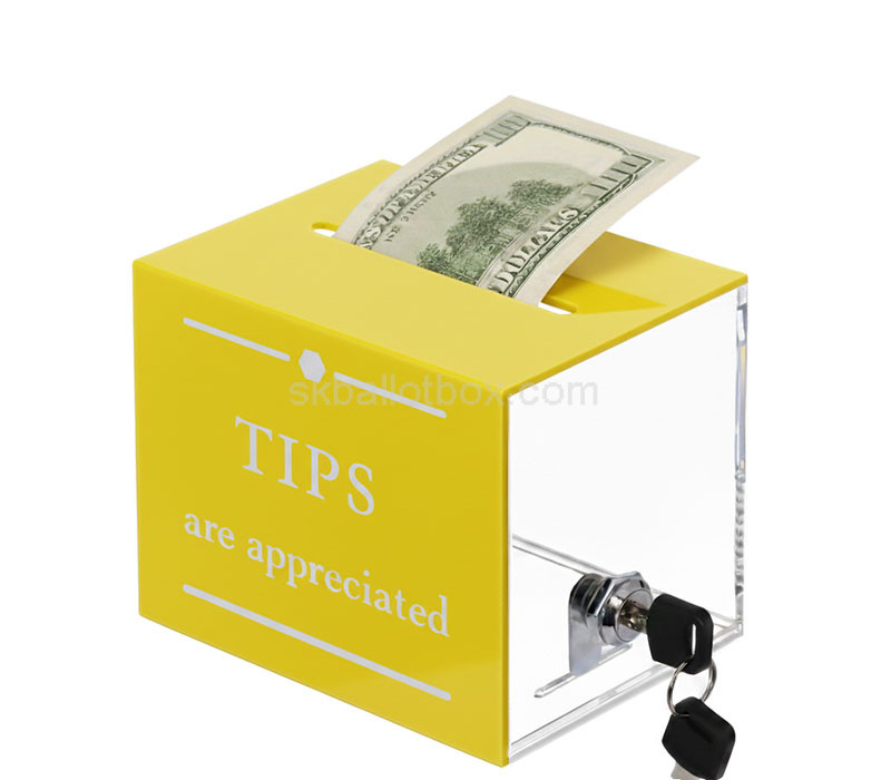 Custom clear + yellow acrylic tips collection box for musicians features a transparent body with vibrant yellow accents for high visibility. Crafted from durable, polished acrylic, it offers secure storage for cash tips while showcasing contents clearly. Ideal for street performers, bands, cafés, and live events, this stylish box enhances presentation and encourages audience support.