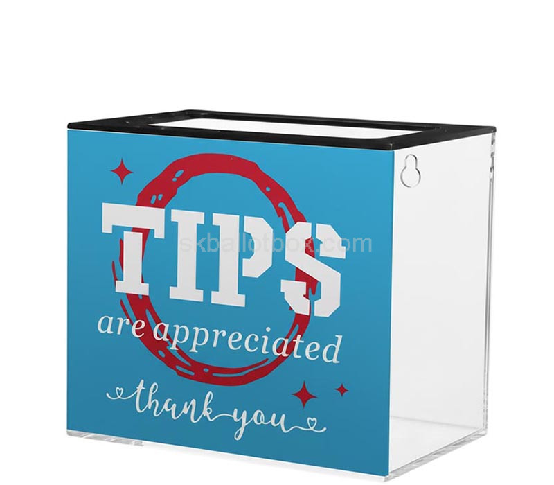 Custom clear + black acrylic wall-mounted café tips collection box with front UV printing. Modern, durable, and easy to mount on any wall. Perfect for cafés, bars, or restaurants seeking a stylish way to collect tips. Doorstep delivery included, with all fees and charges fully covered.
