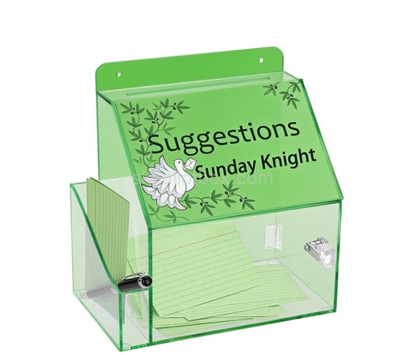 Custom acrylic wall hanging public areas suggestion box. Wholesale only — ideal for collecting suggestions in schools, libraries, hospitals, or other public spaces. Durable and easy to mount. Delivered door-to-door with all taxes paid. A secure and professional solution for public feedback collection.