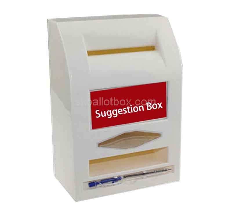 Enhance customer engagement with this sleek white plexiglass suggestion box. Ideal for businesses, hotels, and offices. Features a secure lock and optional custom branding. Wholesale pricing available.