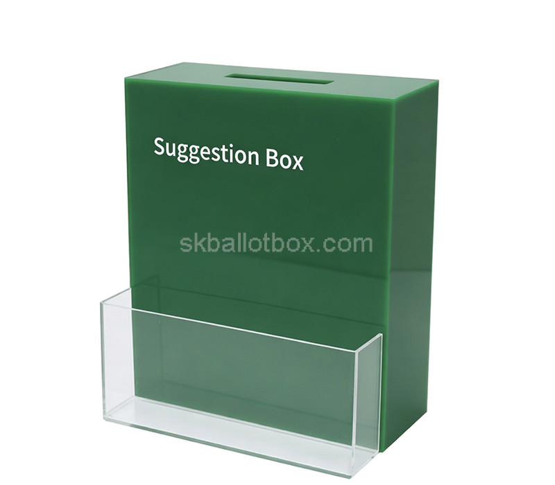 Encourage feedback and promote information with this custom green plexiglass suggestion box featuring a clear flyer holder. Perfect for offices, stores, or events, it securely collects suggestions while displaying flyers or promotional materials. Durable and stylish, this multifunctional box combines practicality with vibrant design, enhancing any reception or public area.