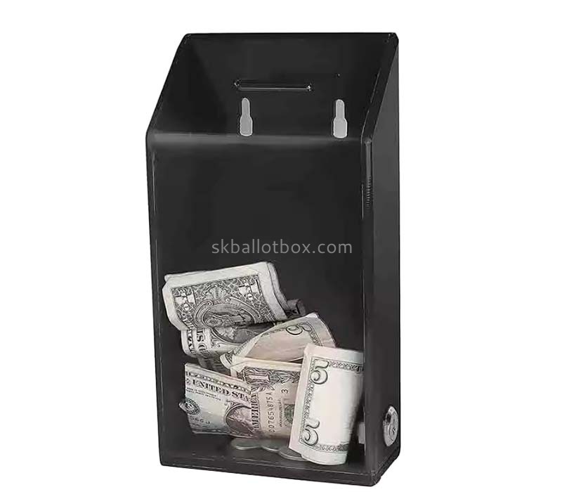 This custom wall-mounted money collection box seamlessly blends clear and black acrylic for a sophisticated aesthetic. Crafted with durable materials, it ensures longevity and security for collected funds. The clear front panel allows for easy visibility of contributions, while the contrasting black frame adds a touch of elegance.