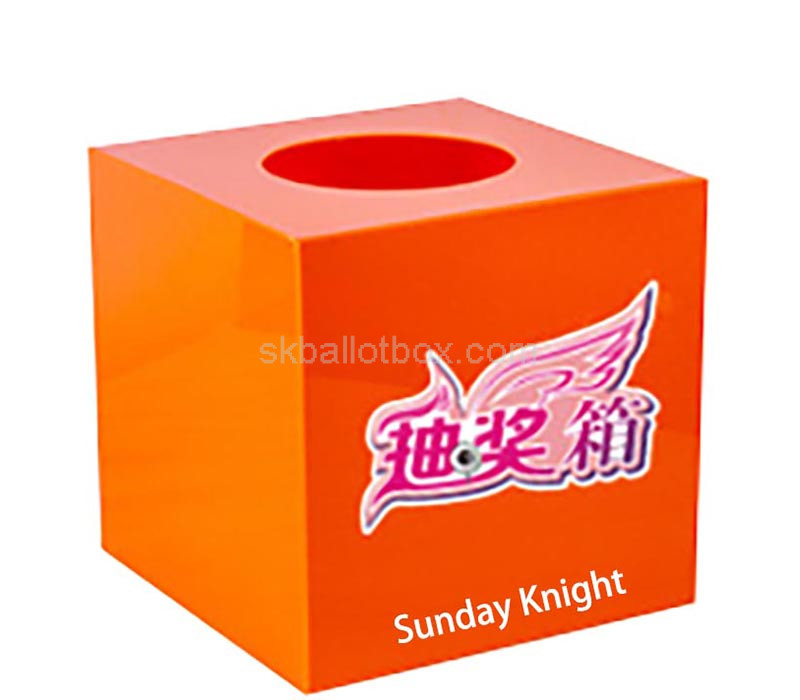 Check out our wholesale custom orange acrylic bonus raffle box, crafted for striking durability. This bold, vibrant box provides a fun and reliable way to gather entries, ideal for events, giveaways, or promotions with standout appeal.