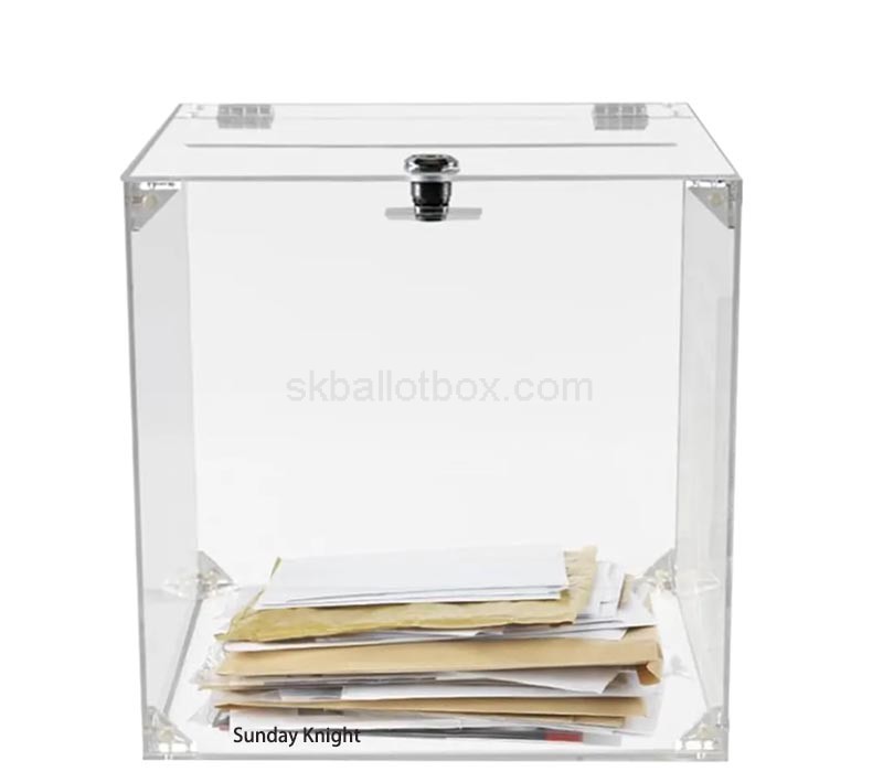 A stylish, custom acrylic mail collection box available for wholesale. This durable design features a clear body for easy visibility and secure mail insertion. Ideal for offices, events, or community centers, it enhances organization while maintaining a professional and modern appearance.