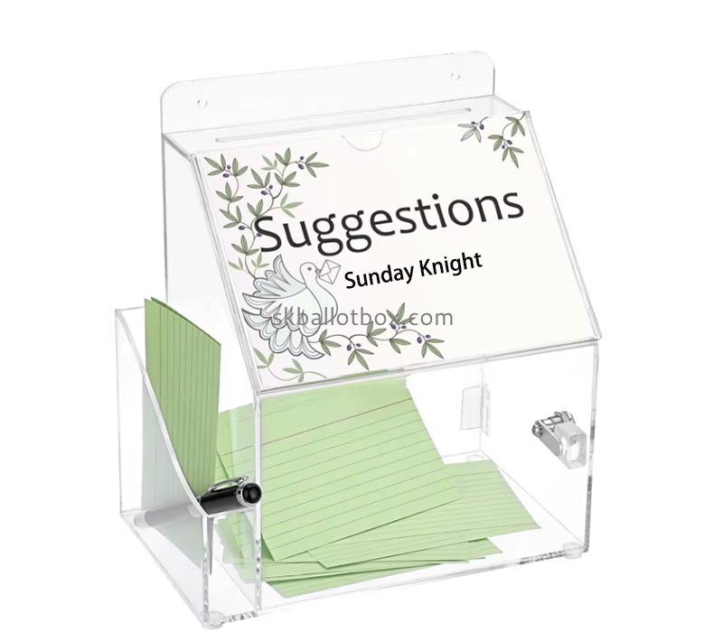 The wholesale custom acrylic suggestion box with a sticky notes holder is an innovative solution designed to simplify the collection of customer feedback or ideas. This box, made from clear acrylic, features a slim profile and a dedicated slot for sticky notes, ensuring that messages are clearly visible and easily accessible.