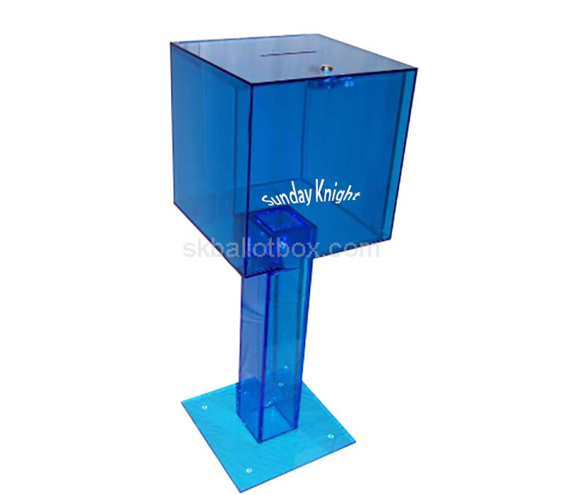 A sleek, wholesale custom translucent blue Lucite floor-standing suggestion box, perfect for offices or events. Durable and modern, it features a sturdy base, secure lid, and ample space for feedback cards, enhancing engagement with its eye-catching, minimalist design.